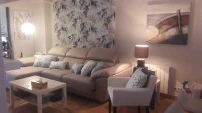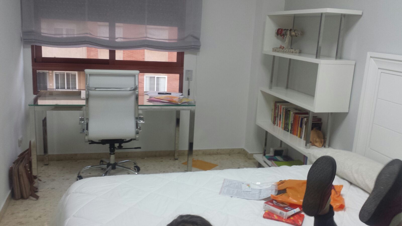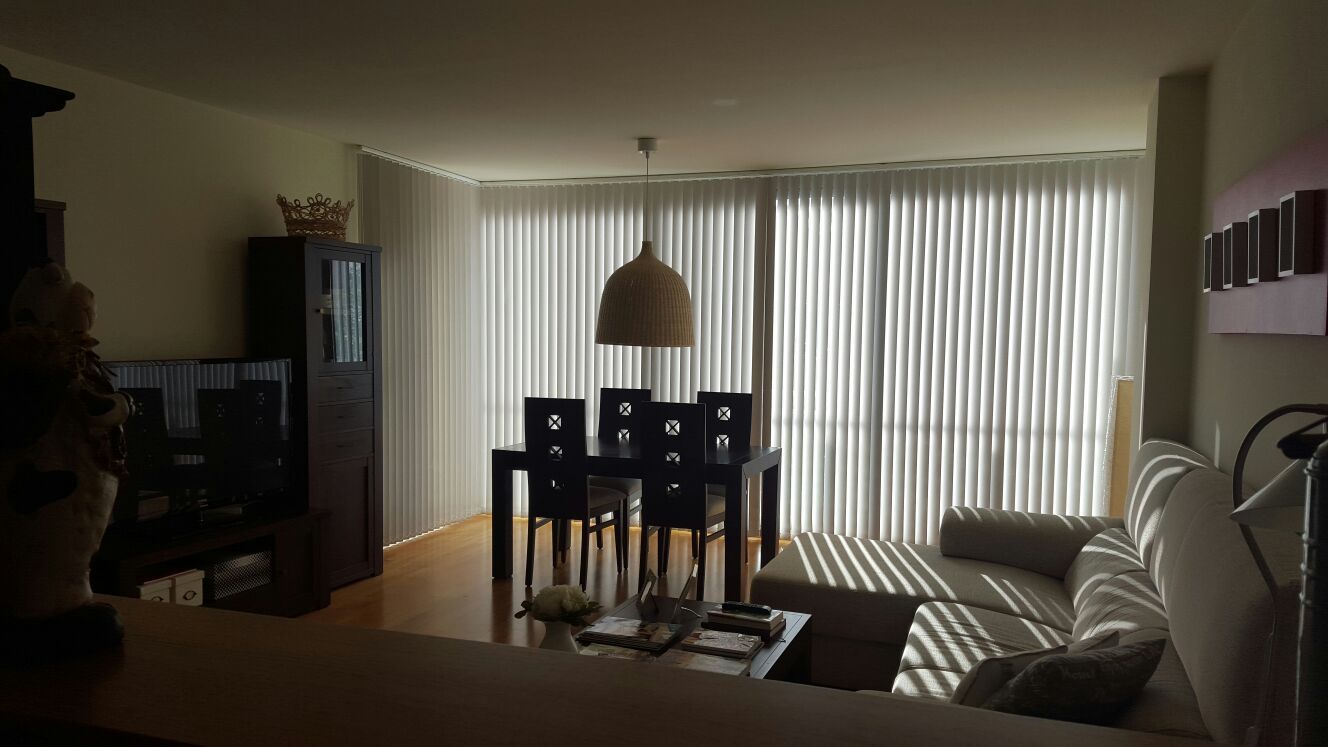 Dormitorio. Cortina confección tablas, colgada en barra niquel mate.