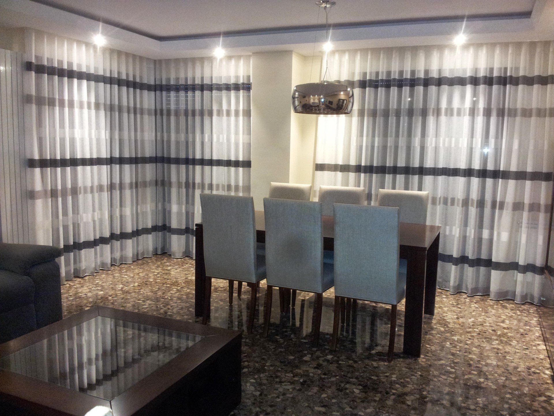 Salón confeccionado con riel manual y cortinas de onda perfecta.